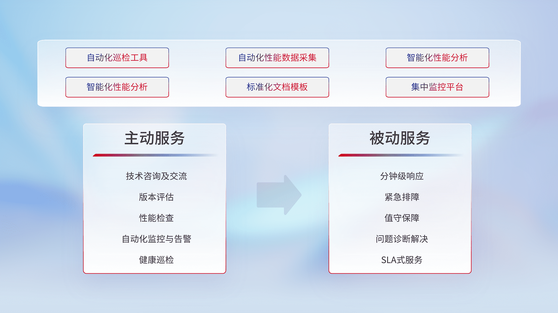 智能化工具和标准化文档,,,保障服务质量,,,提供主动服务(包含技术咨询、、版本评估、、性能检查、、、自动化监控与告警、、健康巡检)和被动服务包含(分钟级响应、、、、紧急排障、、、值守保障、、、问题诊断解决、、SLA服务)。。