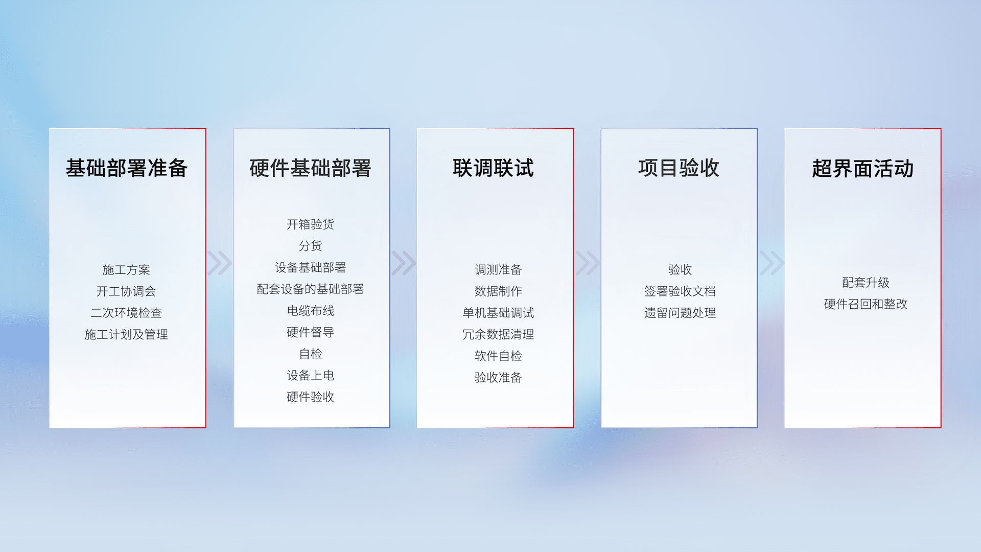 从基础部署准备、、、硬件基础部署、、、、联调联试、、项目验收、、、越界面活动的全过程可追溯,,保证施工质量和进度。。。。